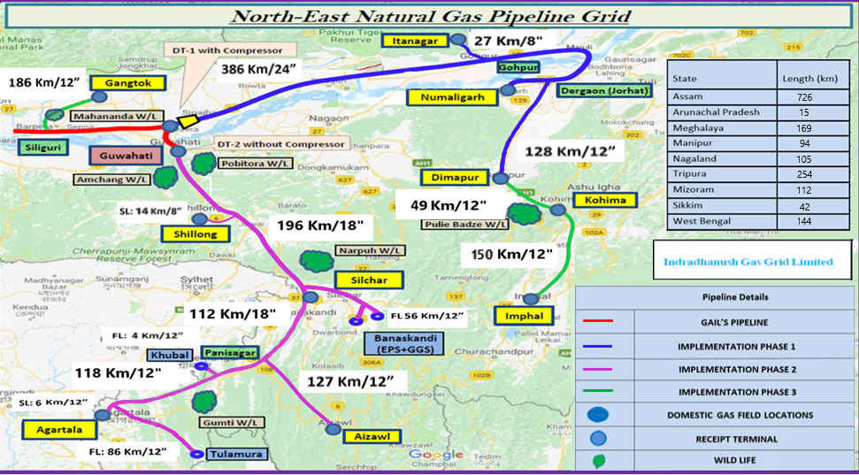 The natural gas pipeline grid in North east would connect Guwahati to capital cities/major cities of North east states like Itanagar, Dimapur, Kohima, Imphal, Aizwal, Agartala, Shillong, Silchar, Gangtok and Numaligarh. The grid would be connected with upcoming Barauni- Guwahati natural gas pipeline as a part of Urja-Ganga scheme. The grid would also connect to sustainable and viable indigenous gas sources in North-east. The pipeline grid has been designed with flexibility for gas injection in either direction.
